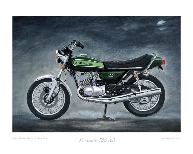 Shown here in green, the 1974 Kawasaki 750 H2B
